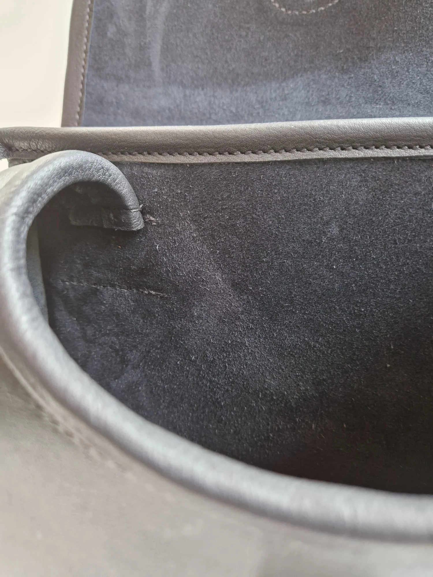 Inside, the suede-lined interior provides a soft yet durable finish that protects your belongings while contributing to the bag’s luxurious feel. Every seam is hand-stitched using strong saddle-stitching techniques, ensuring that this bag is built to last a lifetime. The adjustable shoulder strap, made from full-grain leather, has neatly finished edges and solid brass hardware for both comfort and style.